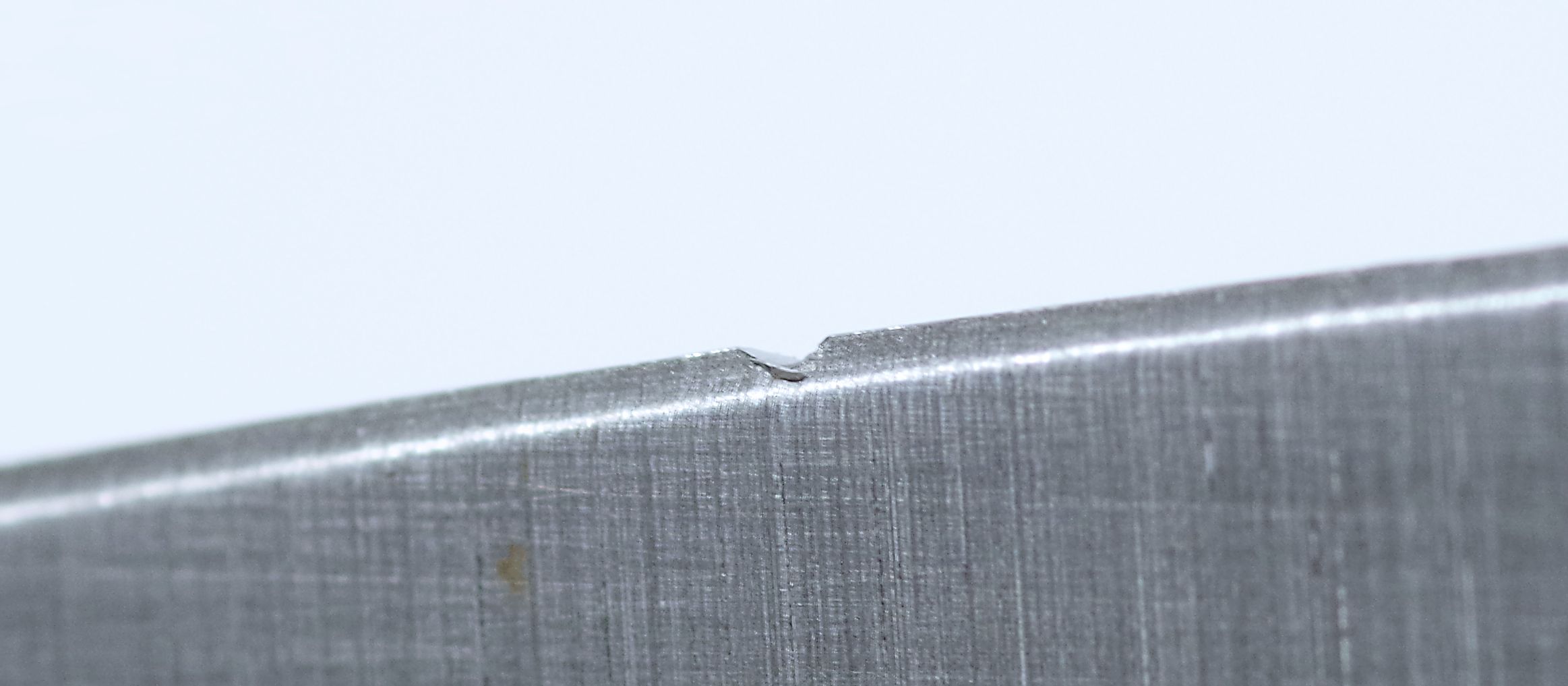 Billigmesser mit SchneidkantenausbruchAusbrüche finde ich indem ich die Schneide über meinen Fingernagel ziehe. Dort wo das Messer hängen bleibt, ist meist ein Ausbruch in der Schneidkante. Ausbrüche bedeuten, dass die Klinge härter rangenommen wurde als es die Schneidengemetrie erlaubt hat. Harte Schneiden, wie die von hochwertigen japanischen Messern neigen eher zu Ausbrüchen, als die weicheren Stähle der europäischen Messer, deren Schneidkante sich eher im Mikrobereich verbiegt. Der gezeigte Ausbruch im Bild links ist schon ziemlich brutal, normalerweise sind Ausbrüche in der Schneidkante kleiner.