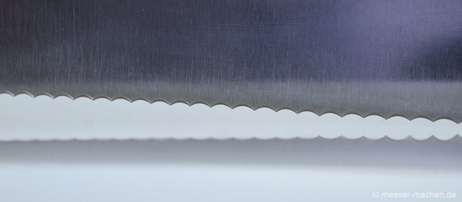 Da diese Designmesser eher auf Schmieren und Spülmaschinentauglichkeit getrimmt sind als auf Schneideigenschaften, macht es auch nicht allzu viel aus. Es gibt einzelne professionelle Messerschärfer, die noch die feinen Wellen der Besteckmesser schleifen. Allerdings benötigen Sie dazu recht teures Zubehör, für jeden Wellenabstand eine eigene Schleifscheibe, daher ist das nichts für daheim.