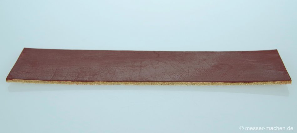 Dieser Lederriemen ist mit reinem EisenoxidEisenoxidriemenbehandelt. Dadurch färbt er zwar etwas ab, weswegen ich ein Küchentuch beim Abziehen unterlege. Solch ein Eisenoxidriemen lässt sich recht leicht selbst herstellen.
