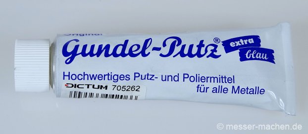 Gundel PutzGundelputz ist ein Poliermittel was seit 1950 existiert. Es poliert Metalle, allerdings ohne Schmirgeleffekt laut Herstellerseite. Mir kommt es jedoch so vor, als würde der Grat ein bisschen besser als mit Leder alleine entfernt werden. Zum Entfernen des Grates würde ich mir sie nicht wieder kaufen, wohl aber zur Pflege von Messern, da es nach der Politur eine Art Schutzfilm hinterlässt, die auch etwas vor Rost schützt.